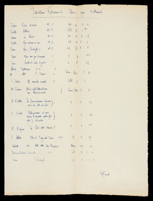 Storia ArchivisticaSul piatto anteriore esterno del registro è scritto a penna "fino al 1968". All'inizio del registro si conserva un foglietto manoscritto da mano ignota, con indicazioni bibliografiche. Dopo l'ultima pagina del registro si conservano due foglietti e un pezzetto di carta strappato, con indicazioni bibliografiche. Fra le pagine del registro si conserva anche un biglietto da visita del dott. Armando L. De Gaetano, indirizzato al prof. Francesco Pagliai.