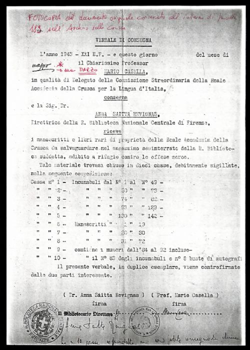 ContenutoElenco manoscritto degli incunaboli e manoscritti conservati nelle 10 casse sigillate consegnate, agli inizi del 1943, dal prof. Mario Casella (delegato della Commissione di riforma dell'Accademia) alla direttrice della Biblioteca Nazionale Centrale di Firenze, Anna Saitta Revignas, per essere depositate nei magazzini sominterrati a scopo di salvaguardia dagli eventi bellici, come attesta il documento della fascetta 189, fotocopiato e inserito nel presente registro.