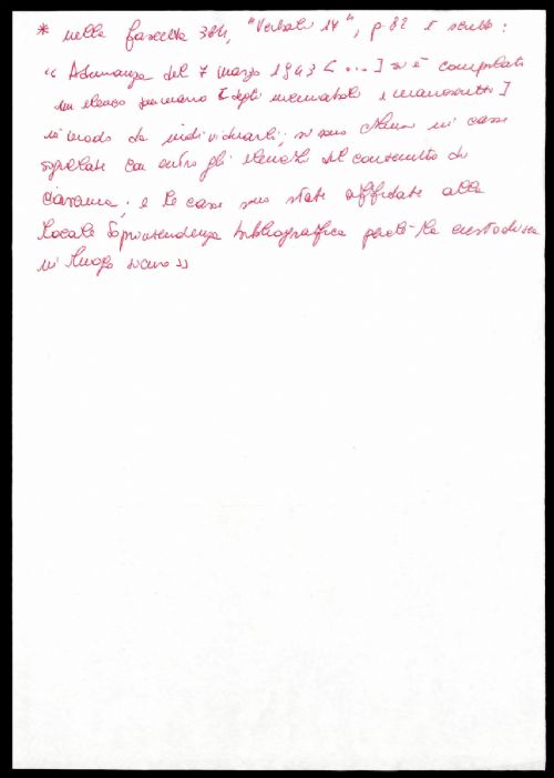 Note DatazioneLa data iniziale è dedotta da quanto scritto nella fascetta 384 "Verbali 17", adunanza del 7 novembre 1942, p. 81: "Il Prof. Casella informa la Commissione di avere iniziato uno schematico catalogo degli incunaboli e dei manoscritti dell'Accademia". La data finale è espressa nel documento conservato nella fascetta 189, la cui fotocopia è stata inserita all'interno della fascetta 1423, e nella fascetta 384 "Verbali 17, p. 82: "Adunanza del 7 marzo 1943 [...]si è compilato un elenco sommario [degli incunaboli e manoscritti] in modo da individuarli; si sono chiusi in casse sigillate con entro gli elenchi del contenuto di ciascuna; e le casse sono state affidate alla locale Soprintendenza bibliografica perché la custodisca in luogo sicuro".