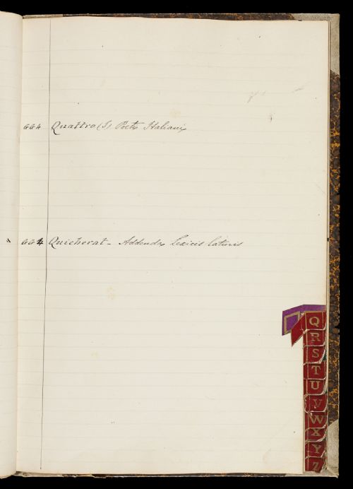 Storia ArchivisticaSul piatto anteriore interno, in alto a sinistra, targhetta cartacea con collocazione "R. Accademia della Crusca 93". Note di anonimi ai lati dell'elenco con segni a lapis, inchiostro rosso, matita rossa e viola; correzioni di collocazioni, cancellature di titoli; aggiunte di titoli ecc. Grafia di mani diverse, non indentificate.