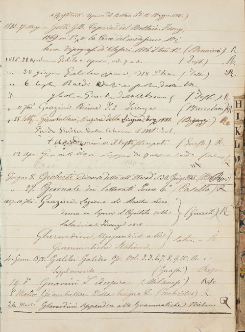 | | Autore | | | Destinatario | | | Titolo | fascetta 607. Registro dei libri prestati | | Pezzo | 607 | | Tipologia documentaria | | | Data Iniziale | 1840 | | Data Finale | 18 gennaio 1868 | | Note Datazione | Il Registro è stato redatto a partire dal 1852, ma raccoglie dati antecedenti a questa data, copiati da un precedente Registro. | | Consistenza | 230 cc. | | Sottoscrizione | Scegli | | Storia Archivistica | Il registro reca sulla coperta anteriore, all'esterno, un'etichetta con scritto «Registro» e, sulla costola, è scritto «Registro dei libri prestati». Sulla carta di guardia del registro è scritto: «Registro delle Opere appartenenti alla Biblioteca dell'I. e R. Accademia della Crusca le quali si danno in prestito ai Signori Accademici per i loro studj», e, sotto: «A dì 28 Gennaio 1852. In questo giorno fu trascritto nel presente Registro tutte le Opere che restavano accese ai Signori Accademici nel vecchio Repertorio». | | Contenuto | Si tratta di un registro di prestito della Biblioteca della Crusca, con i titoli dei libri prestati agli Accademici per i loro studi, relativo agli anni 1840-1868. In appendice cè un registro dei libri presi in prestito dalle biblioteche pubbliche. | | Lingua | Italiano. | | Strumenti Ricerca | | | Stato Conservazione | In discreto stato. | | Allegati | | | Bibliografia | | | Nomi | | | Luoghi | |