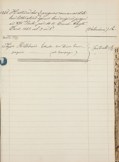 | | Autore | | | Destinatario | | | Titolo | fascetta 607. Registro dei libri prestati | | Pezzo | 607 | | Tipologia documentaria | | | Data Iniziale | 1840 | | Data Finale | 18 gennaio 1868 | | Note Datazione | Il Registro è stato redatto a partire dal 1852, ma raccoglie dati antecedenti a questa data, copiati da un precedente Registro. | | Consistenza | 230 cc. | | Sottoscrizione | Scegli | | Storia Archivistica | Il registro reca sulla coperta anteriore, all'esterno, un'etichetta con scritto «Registro» e, sulla costola, è scritto «Registro dei libri prestati». Sulla carta di guardia del registro è scritto: «Registro delle Opere appartenenti alla Biblioteca dell'I. e R. Accademia della Crusca le quali si danno in prestito ai Signori Accademici per i loro studj», e, sotto: «A dì 28 Gennaio 1852. In questo giorno fu trascritto nel presente Registro tutte le Opere che restavano accese ai Signori Accademici nel vecchio Repertorio». | | Contenuto | Si tratta di un registro di prestito della Biblioteca della Crusca, con i titoli dei libri prestati agli Accademici per i loro studi, relativo agli anni 1840-1868. In appendice cè un registro dei libri presi in prestito dalle biblioteche pubbliche. | | Lingua | Italiano. | | Strumenti Ricerca | | | Stato Conservazione | In discreto stato. | | Allegati | | | Bibliografia | | | Nomi | | | Luoghi | |