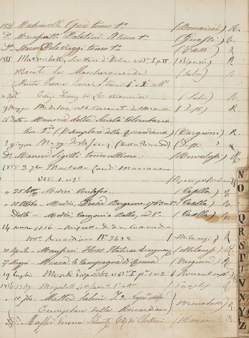 | | Autore | | | Destinatario | | | Titolo | fascetta 607. Registro dei libri prestati | | Pezzo | 607 | | Tipologia documentaria | | | Data Iniziale | 1840 | | Data Finale | 18 gennaio 1868 | | Note Datazione | Il Registro è stato redatto a partire dal 1852, ma raccoglie dati antecedenti a questa data, copiati da un precedente Registro. | | Consistenza | 230 cc. | | Sottoscrizione | Scegli | | Storia Archivistica | Il registro reca sulla coperta anteriore, all'esterno, un'etichetta con scritto «Registro» e, sulla costola, è scritto «Registro dei libri prestati». Sulla carta di guardia del registro è scritto: «Registro delle Opere appartenenti alla Biblioteca dell'I. e R. Accademia della Crusca le quali si danno in prestito ai Signori Accademici per i loro studj», e, sotto: «A dì 28 Gennaio 1852. In questo giorno fu trascritto nel presente Registro tutte le Opere che restavano accese ai Signori Accademici nel vecchio Repertorio». | | Contenuto | Si tratta di un registro di prestito della Biblioteca della Crusca, con i titoli dei libri prestati agli Accademici per i loro studi, relativo agli anni 1840-1868. In appendice cè un registro dei libri presi in prestito dalle biblioteche pubbliche. | | Lingua | Italiano. | | Strumenti Ricerca | | | Stato Conservazione | In discreto stato. | | Allegati | | | Bibliografia | | | Nomi | | | Luoghi | |