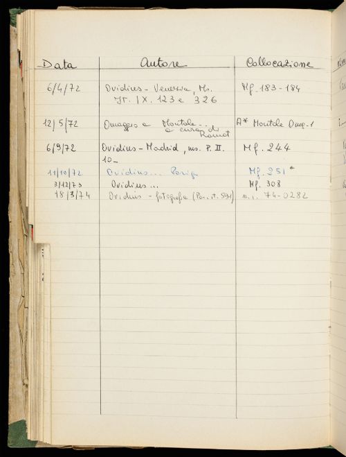 Storia ArchivisticaSul piatto anteriore esterno del registro è dattiloscritto il titolo. Sul piatto anteriore interno, in alto a sinistra, targhetta cartacea con indirizzo e ragione sociale della cartoleria Pistoj. Nella prima pagina di guardia sono appuntati con un fermacarte due foglietti con appunti di collocazioni bibliografiche. Due foglietti con appunti anche in corrispondenza della lettera "M".