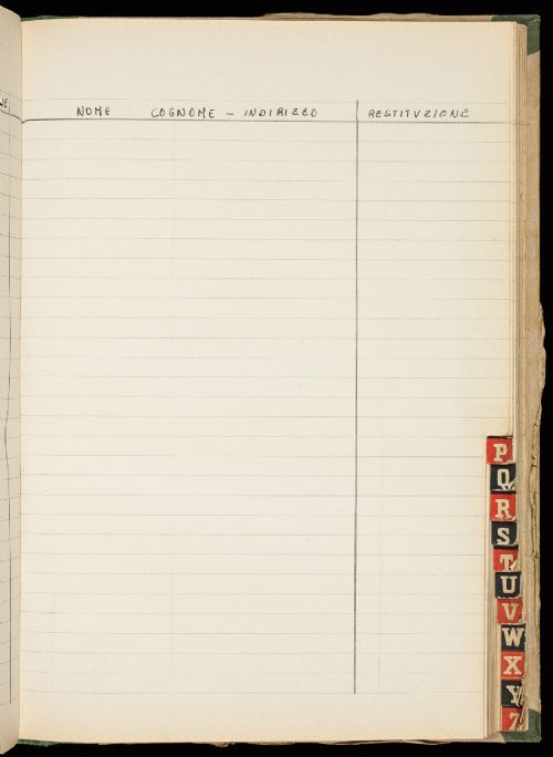 Storia ArchivisticaSul piatto anteriore esterno del registro è dattiloscritto il titolo. Sul piatto anteriore interno, in alto a sinistra, targhetta cartacea con indirizzo e ragione sociale della cartoleria Pistoj. Nella prima pagina di guardia sono appuntati con un fermacarte due foglietti con appunti di collocazioni bibliografiche. Due foglietti con appunti anche in corrispondenza della lettera "M".