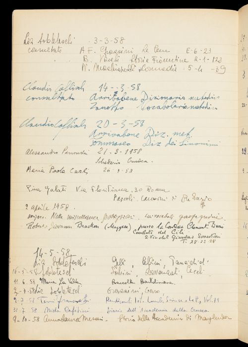 | Storia Archivistica | Sul piatto anteriore esterno del registro è scritto a penna "fino al 1968". All'inizio del registro si conserva un foglietto manoscritto da mano ignota, con indicazioni bibliografiche. Dopo l'ultima pagina del registro si conservano due foglietti e un pezzetto di carta strappato, con indicazioni bibliografiche. Fra le pagine del registro si conserva anche un biglietto da visita del dott. Armando L. De Gaetano, indirizzato al prof. Francesco Pagliai. |