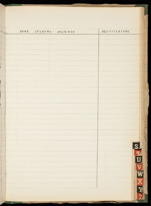 Storia ArchivisticaSul piatto anteriore esterno del registro è dattiloscritto il titolo. Sul piatto anteriore interno, in alto a sinistra, targhetta cartacea con indirizzo e ragione sociale della cartoleria Pistoj. Nella prima pagina di guardia sono appuntati con un fermacarte due foglietti con appunti di collocazioni bibliografiche. Due foglietti con appunti anche in corrispondenza della lettera "M".
