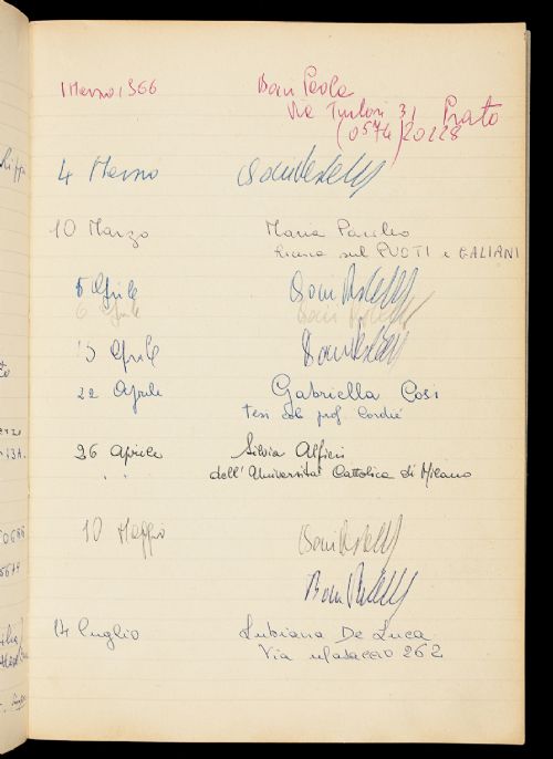 | Storia Archivistica | Sul piatto anteriore esterno del registro è scritto a penna "fino al 1968". All'inizio del registro si conserva un foglietto manoscritto da mano ignota, con indicazioni bibliografiche. Dopo l'ultima pagina del registro si conservano due foglietti e un pezzetto di carta strappato, con indicazioni bibliografiche. Fra le pagine del registro si conserva anche un biglietto da visita del dott. Armando L. De Gaetano, indirizzato al prof. Francesco Pagliai. |