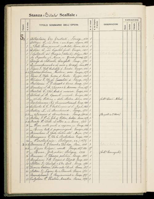 | Contenuto | Elenco dei volumi conservati nella Biblioteca dell'Accademia relativamente allo scaffale XLII (dono di Gino Capponi), scaffale XLIII (dono di L.M. Rezzi) e della Stanza dei Citati, la cui pubblicazione non va oltre l'anno 1921. |