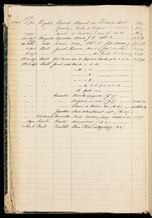| Contenuto | Registro degli Accademici che hanno avuto prestito dalla Biblioteca dell'Accademia opere e opuscoli per loro studi dal 1852 al 1902. |