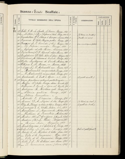 | Contenuto | Elenco dei volumi conservati nella Biblioteca dell'Accademia relativamente allo scaffale XLII (dono di Gino Capponi), scaffale XLIII (dono di L.M. Rezzi) e della Stanza dei Citati, la cui pubblicazione non va oltre l'anno 1921. |