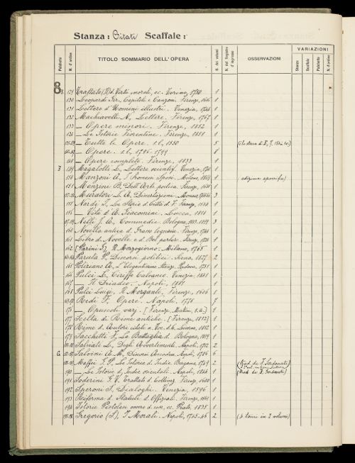 | Contenuto | Elenco dei volumi conservati nella Biblioteca dell'Accademia relativamente allo scaffale XLII (dono di Gino Capponi), scaffale XLIII (dono di L.M. Rezzi) e della Stanza dei Citati, la cui pubblicazione non va oltre l'anno 1921. |