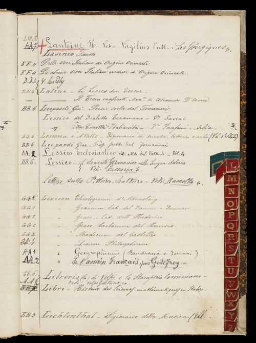 ContenutoCatalogo della bibliotechina dell'Accademia, organizzato a rubrica in ordine alfabetico per autore. Annotazioni manoscritte ai margini, relative a cambiamento di collocazione dei volumi. Redazione a pių mani in anni e probabilmente in anni diversi, che non vanno oltre il 1912.